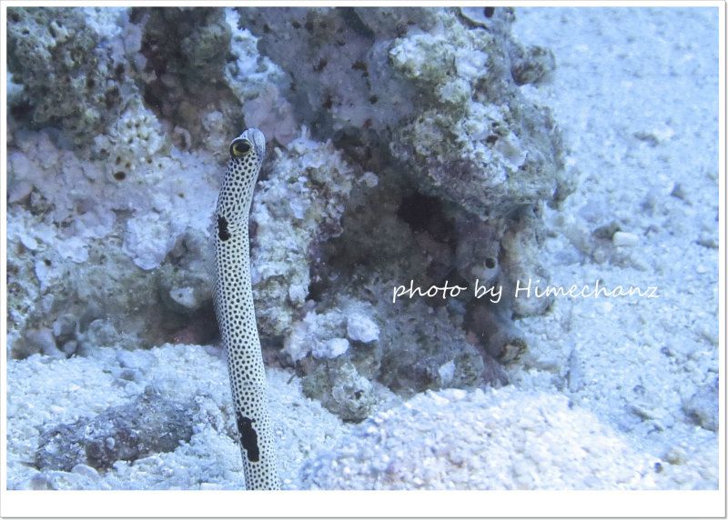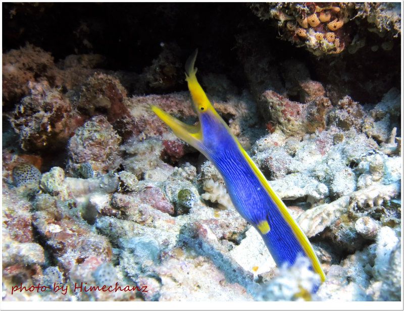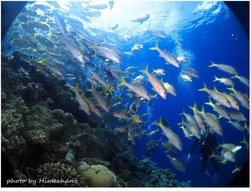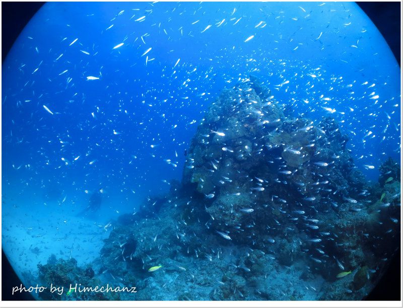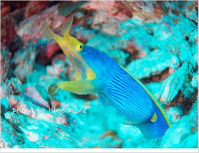 青いハナヒゲウツボやナンヨウハギ、チンアナゴやスカシテンジクダイの群れなど、